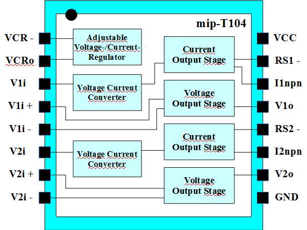 Der mip-T104 wurde für die 0/4 – 20mA-Strom- (3-Draht) und die Spannungs-Schnittstellen entwickelt (Nachfolger von mip-T202). Er enthält jeweils 2 Strom- und 2 Spannungs-Schnittstellen. Der Baustein eignet sich aber auch als Ansteuerung für LEDs (Helligkeitssteuerung möglich) und als steuerbare Strom- oder Spannungsquellen (Umsetzer von kleinen auf große Spannungen). Mit externen npn-Treibertransistoren sind Ströme bis jeweils maximal 100mA zulässig. Zusätzlich enthält der Baustein noch einen steuerbaren Spannungs-/Strom-Regler, der die restlichen Bauteile (Sensor, Prozessor, …) versorgen und schützen kann (Frame-Konzept).